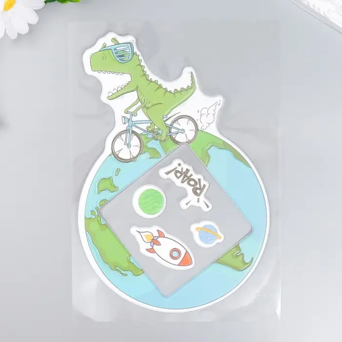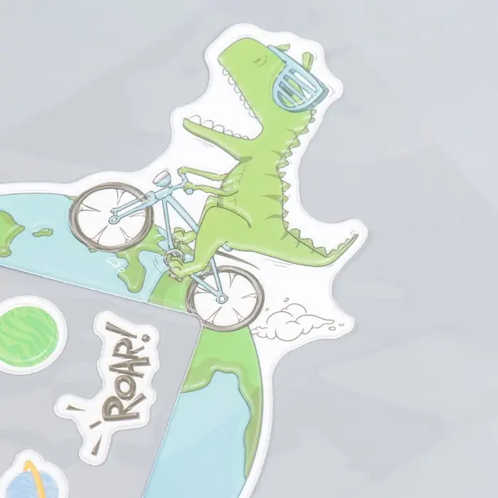 Наклейка на выключатель "Динозавр на велике" окно 8,5х8,5 см, объемная 26х16,5 см