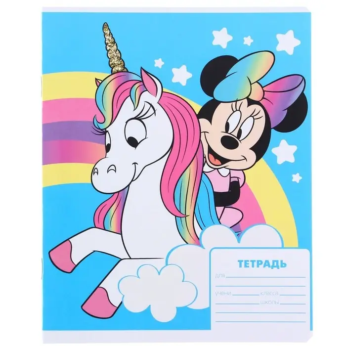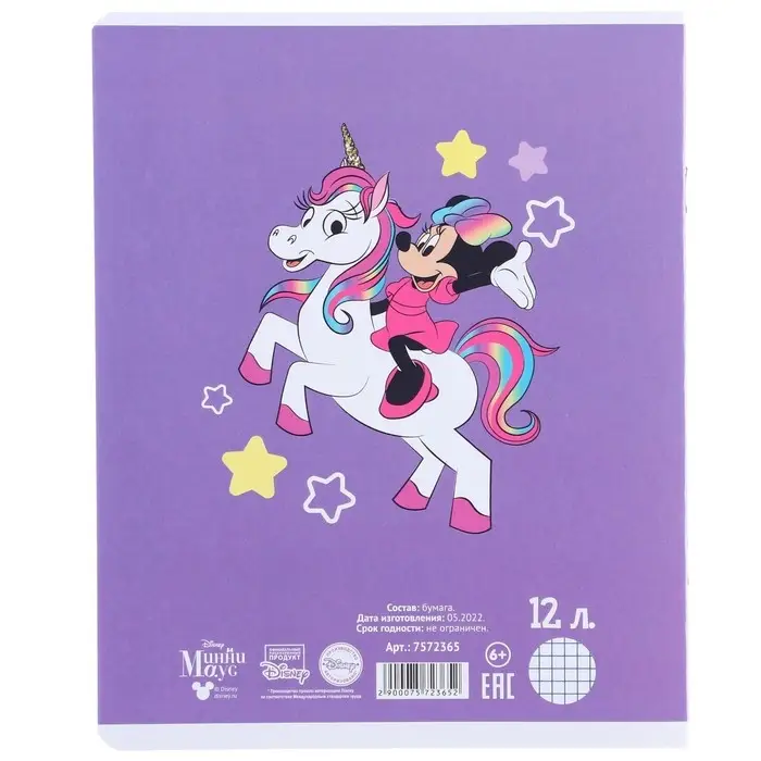 Тетрадь в клетку 12 листов, 5 видов МИКС, обложка мелованный картон, «Минни Маус и единорог»