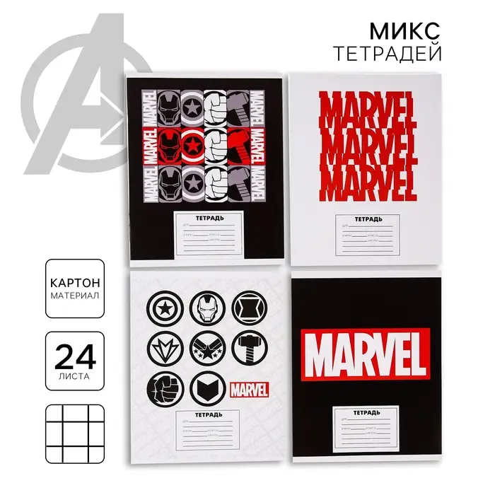 Тетрадь в клетку 24 листа, 4 вида МИКС, обложка мелованный картон, «Мстители»