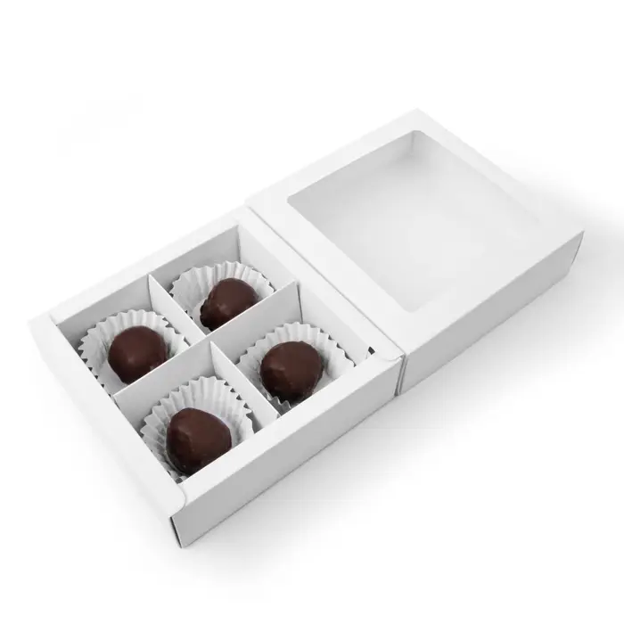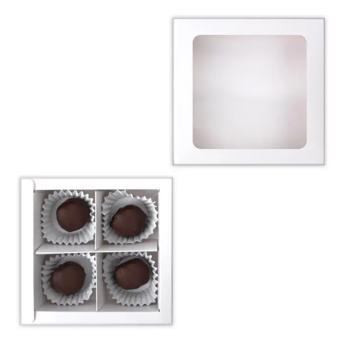 Мини-коробка для конфет с окошком на 4 ячейки, белая — это маленькая квадратная упаковка с прозрачной вставкой. Её компактность, элегантный белый цвет и возможность заглянуть внутрь делают её идеальной для презентации отборных сладостей.