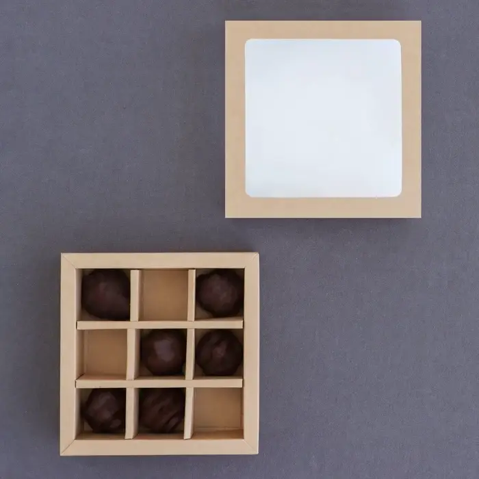 Маленькая конфетная коробка из крафта на 9 ячеек — это небольшая квадратная упаковка из натурального картона. Её небольшой размер и естественный вид идеальны для символического, но тёплого знака внимания.