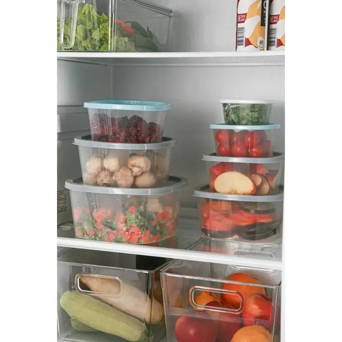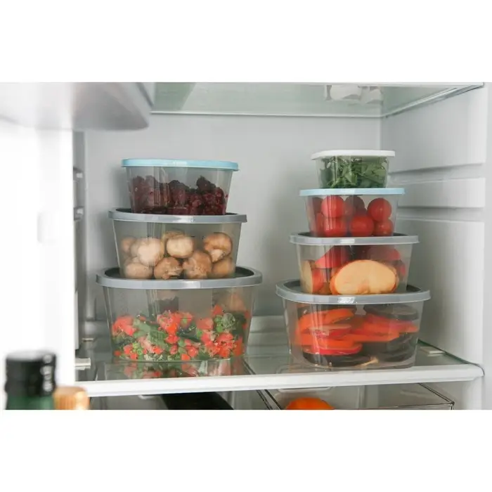 - Квадратная форма экономит место в холодильнике и идеально вписывается в стандартные секции.