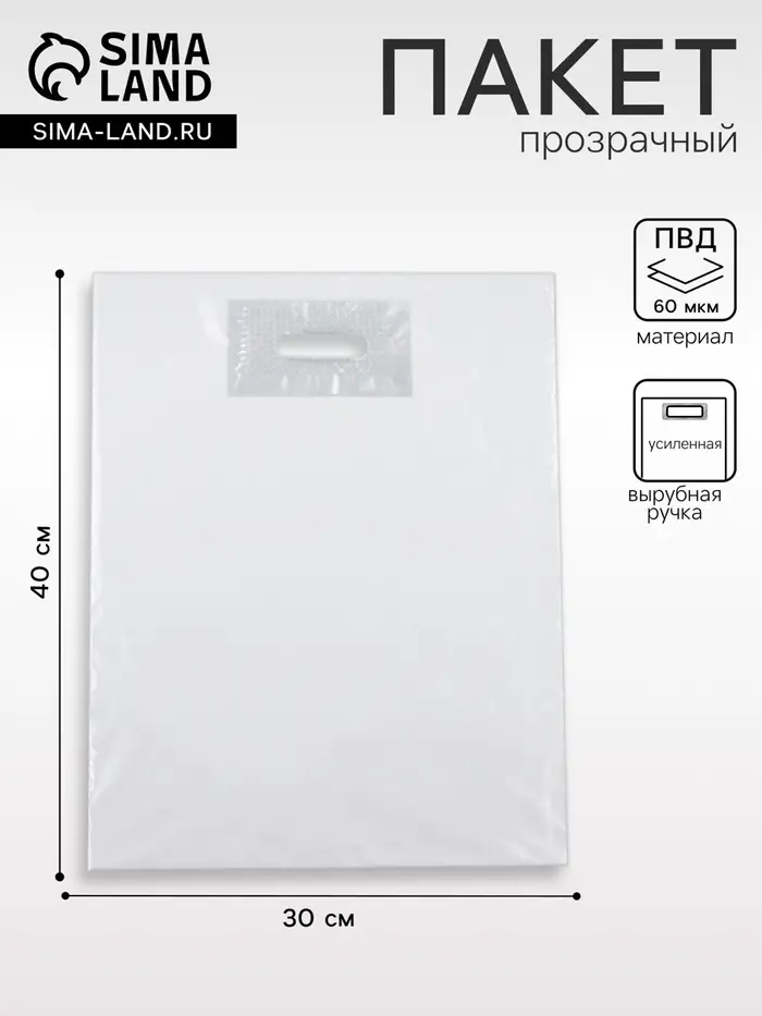Пакет полиэтиленовый с вырубной ручкой, прозрачный 30×40 см, 60 мкм