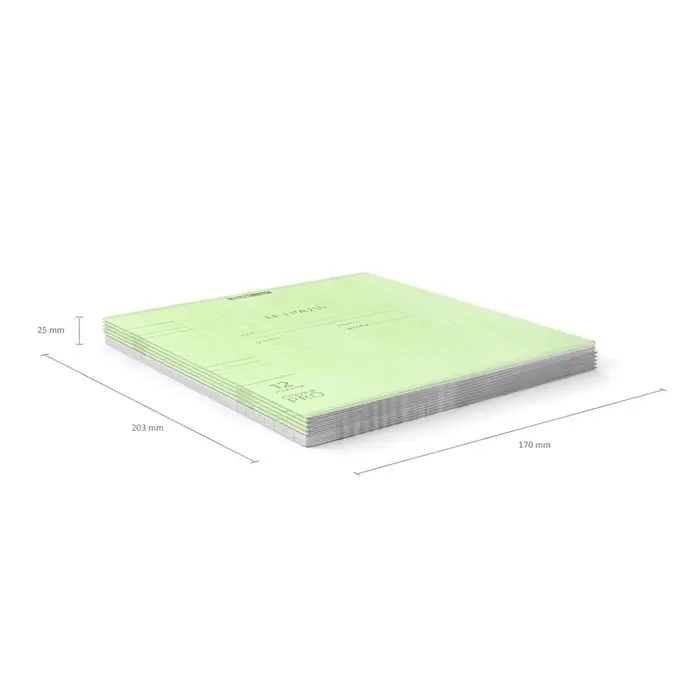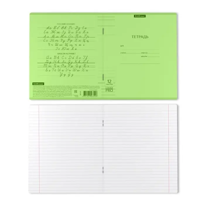 Тетрадь школьная ученическая формата А5+ (170x203 мм). Двойная обложка: внешняя выполнена из высококачественного износостойкого цветного пластика с фактурой «апельсиновая корка», внутренняя — из офсетной бумаги. В блоке 12 листов в линейку. Бумага офсетная плотностью 60 г/м2. Цвет линовки — синий. Скругленные уголки обложки и блока. Тип скрепления — скоба. Тетради упакованы в термоусадочную пленку по 10 штук.