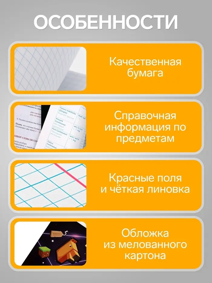- Внутренний блок содержит 36 листов в клетку с высоким показателем белизны для комфортной работы с текстом и графиками.