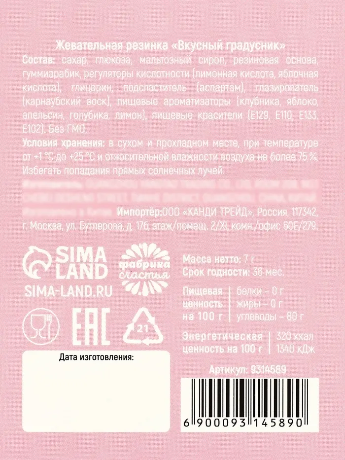 Состав: сахар, глюкоза, мальтозный сироп, резиновая основа, гуммиарабик, регуляторы кислотности (лимонная кислота, яблочная кислота), глицерин, подсластитель (аспартам), глазирователь (карнаубский воск), пищевые ароматизаторы (клубника, яблоко, апельсин, голубика, лимон), пищевые красители (E129, E110, E133, E102). Без ГМО.