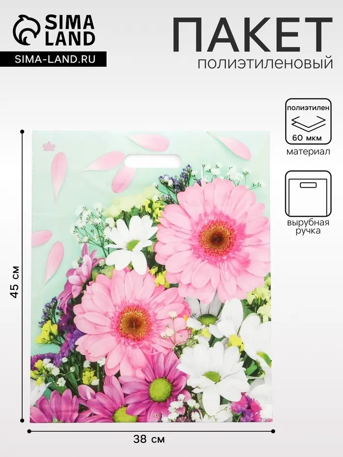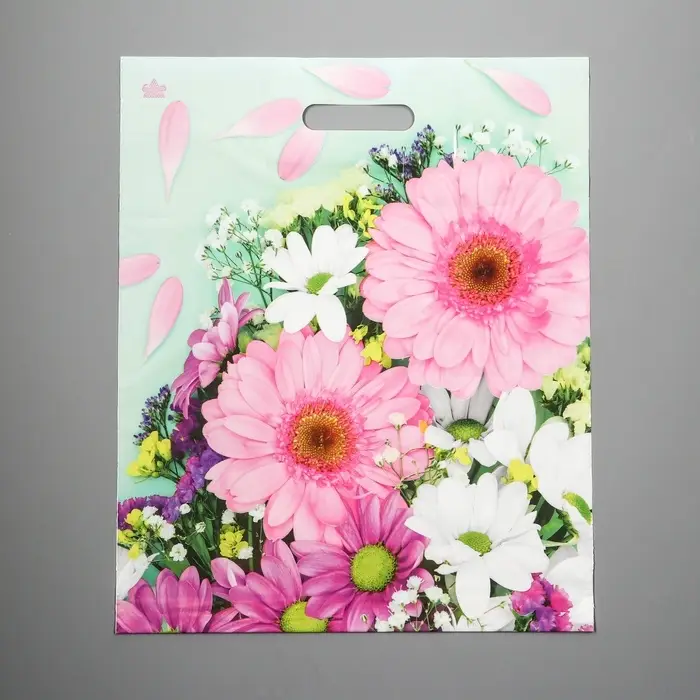 - Нежный букет гербер: Сочные оттенки и детализированный рисунок цветов делают пакет самостоятельным декором. Такую упаковку приятно подарить на 8 Марта, день рождения или просто без повода.