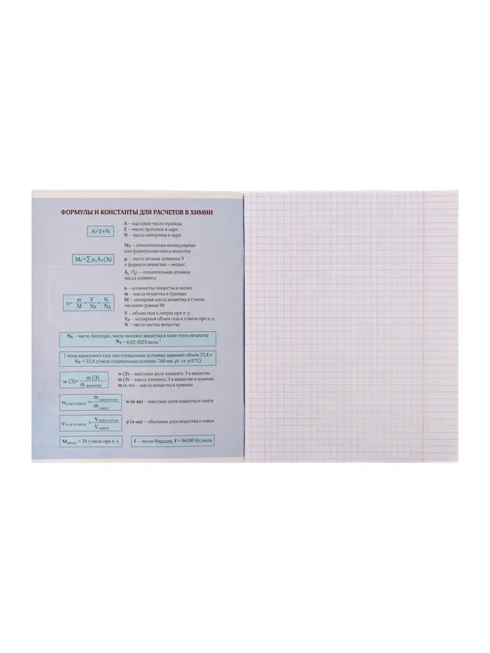 Составление химических уравнений и расчёты по формулам требуют внимания к деталям. Клетчатая разметка помогает аккуратно оформлять реакции и таблицы, а справочные материалы содержат периодическую систему, таблицу растворимости и основные константы.