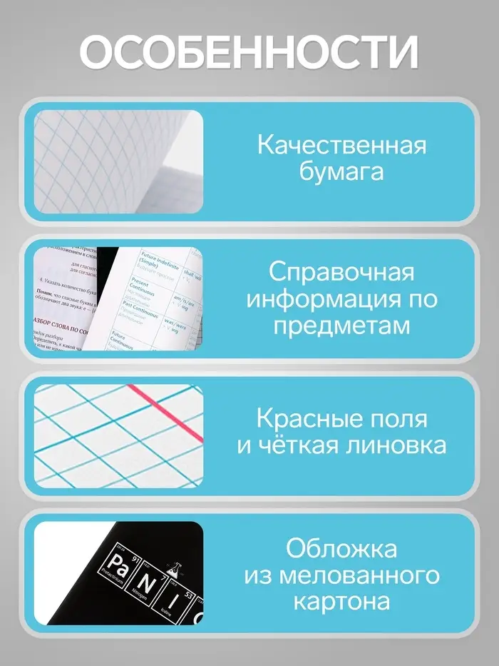 - Сорок восемь листов в клетку с высоким показателем белизны — формулы и схемы выглядят контрастно.
