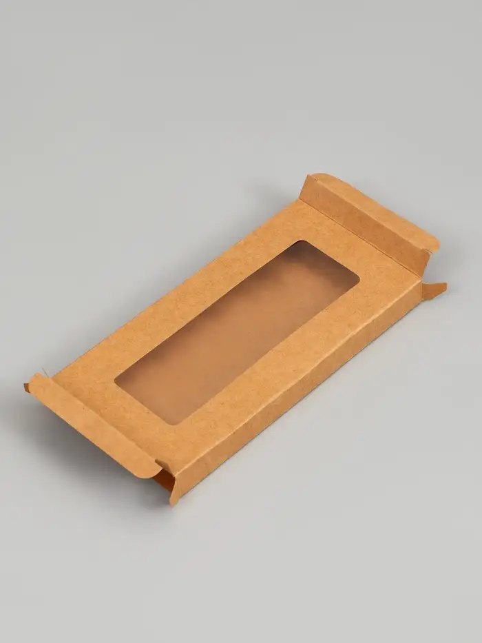 - Для кондитеров и производителей шоколада: Коробка подходит для упаковки шоколада ручной работы, крафтового шоколада, подарочных плиток. Окно демонстрирует этикетку или декор шоколада, не требуя вскрытия упаковки. Крафтовый цвет коробки контрастирует с яркой обёрткой.