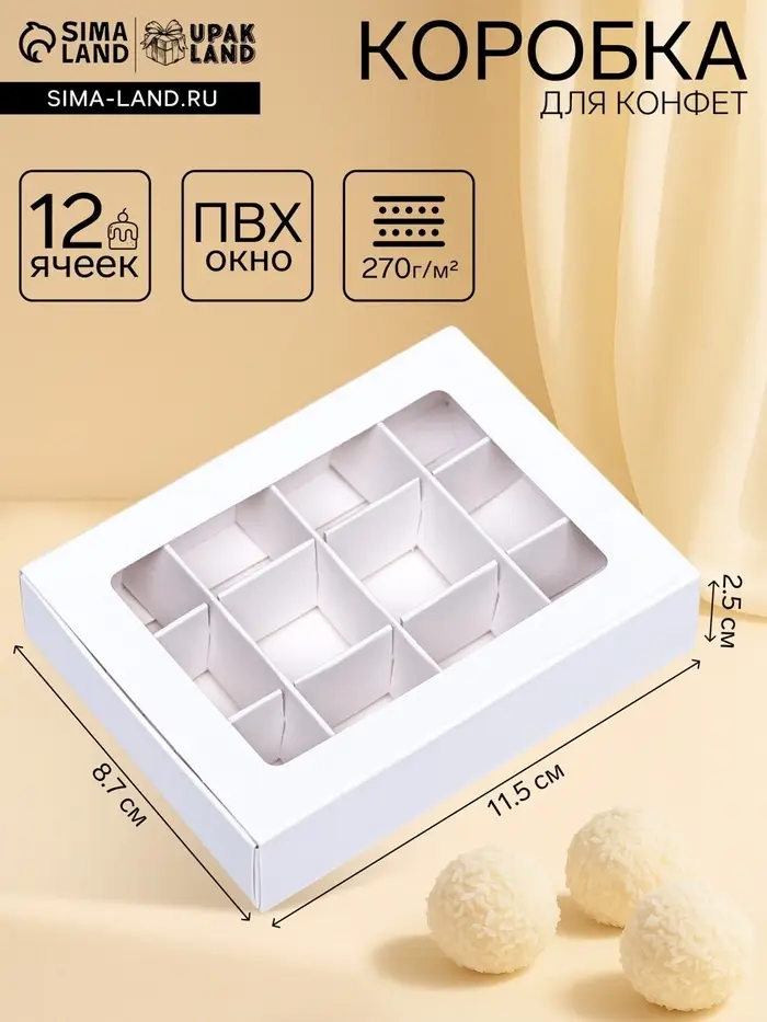 Коробка для 12 конфет, 11.5×8.7×2.5 см, Тонкие разделители, белый