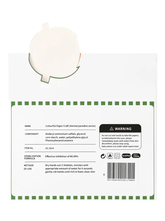 Способ применения: Достаньте сухими руками 1-2 листа, намочите портативное мыло и потрите ладони до образования пены, смойте водой.