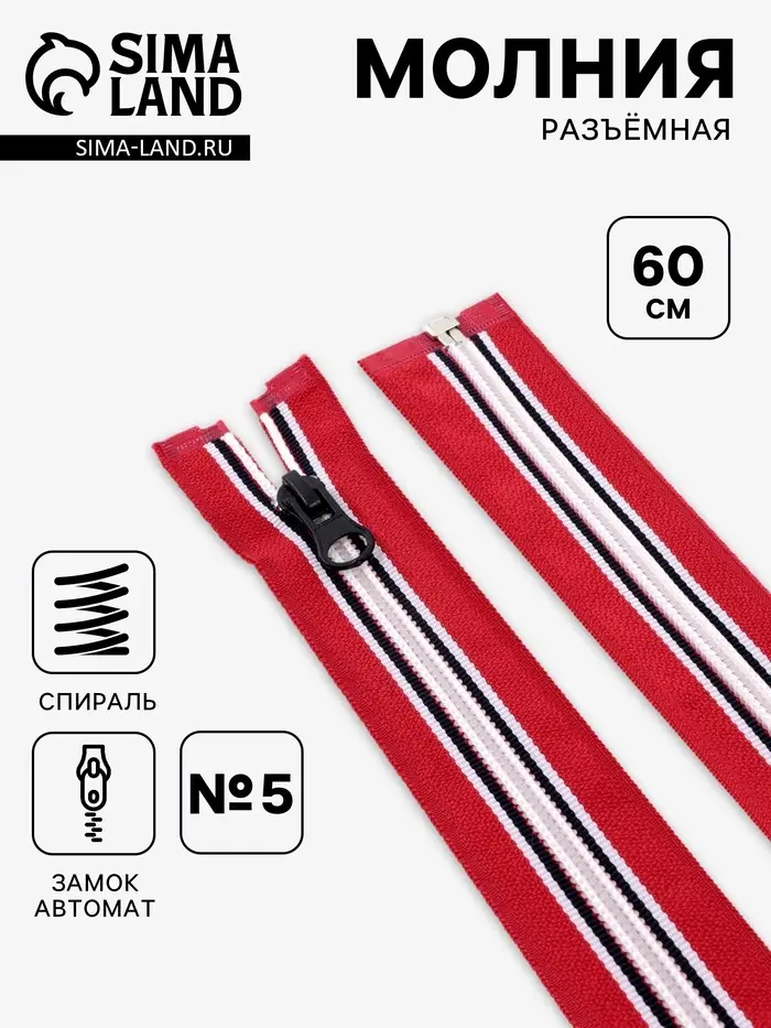 Молния «Спираль», №5, разъёмная, замок автомат, 60 см, красная, белая, чёрная
