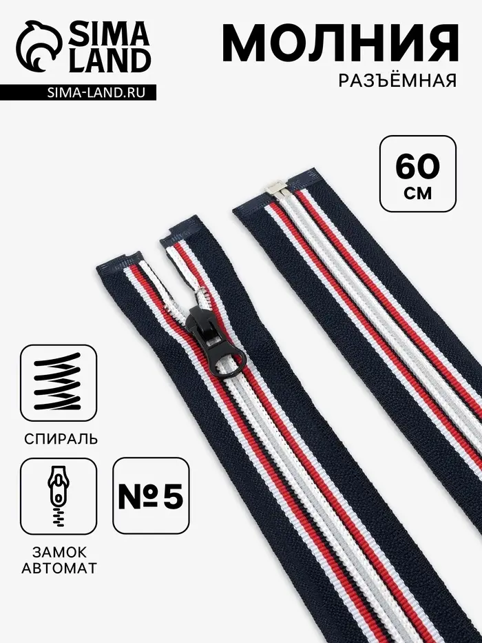 Молния «Спираль», №5, разъёмная, замок автомат, 60 см, тёмно-синяя, красный, белый