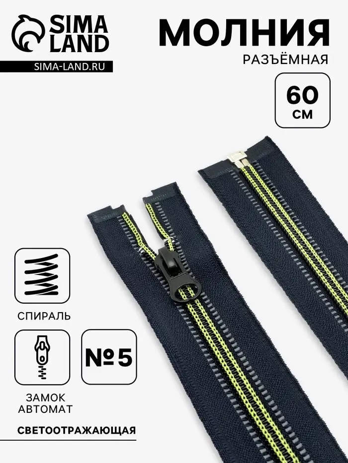 Молния «Спираль», №5, разъёмная, светоотражающая, замок автомат, 60 см, чёрная, зелёная