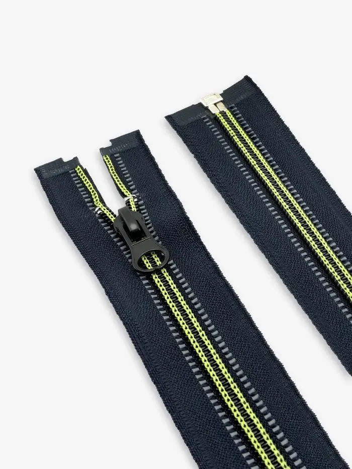 Бегунок плавно перемещается по зубчикам. Молния является разъёмной — замочек на конце полностью расстёгивается. Номер обозначает ширину зубчиков в миллиметрах. Чаще всего такую застёжку используют для шитья толстовок, спортивных вещей, туристического снаряжения и многого другого.