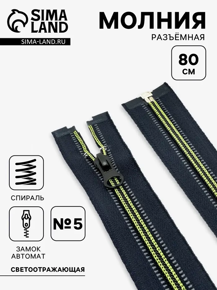 Молния «Спираль», №5, разъёмная, светоотражающая, замок автомат, 80 см, чёрная, зелёная