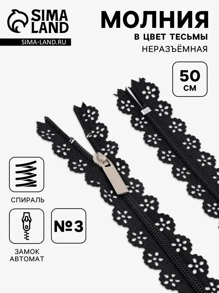 Молния «Спираль», №3, неразъёмная, ажурная, замок автомат, 50 см, чёрная