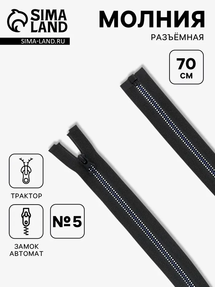 Молния «Трактор», №5, разъёмная, замок автомат, 70 см, чёрная, белая, синяя