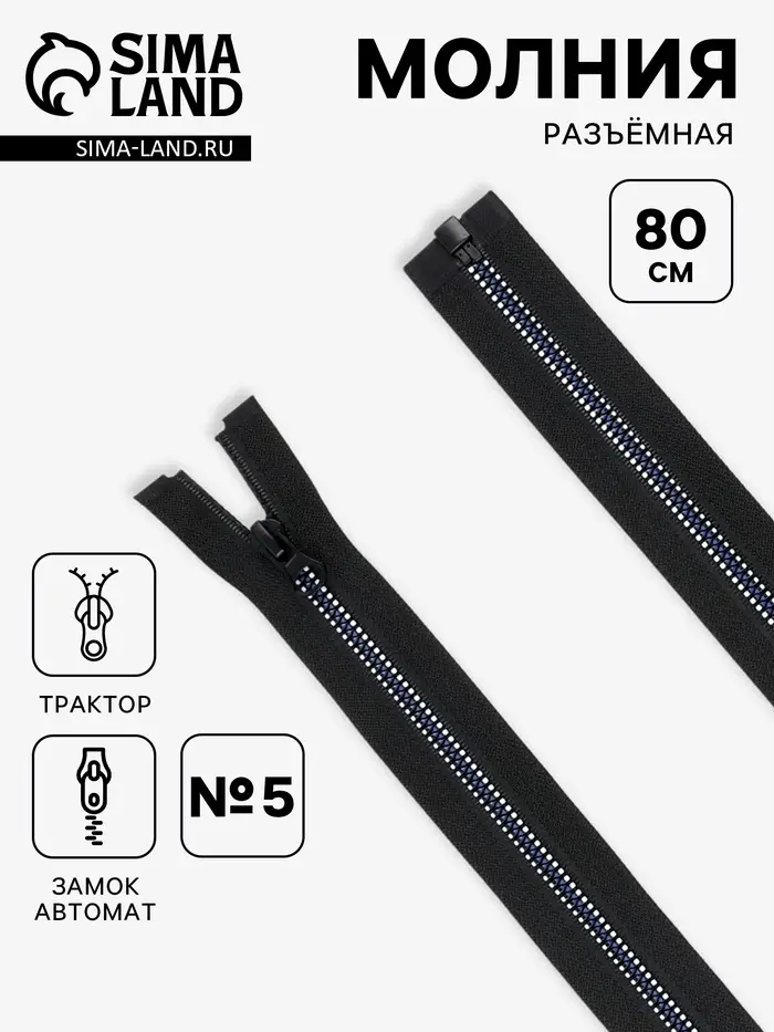 Молния «Трактор», №5, разъёмная, замок автомат, 80 см, чёрная, белая, синяя