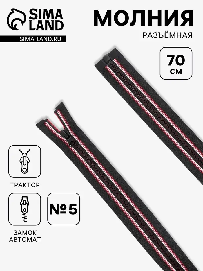 Молния «Трактор», №5, разъёмная, замок автомат, 70 см, чёрная, красная, белая