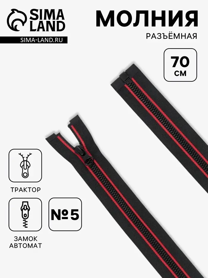 Молния «Трактор», №5, разъёмная, замок автомат, 70 см, чёрная, красная