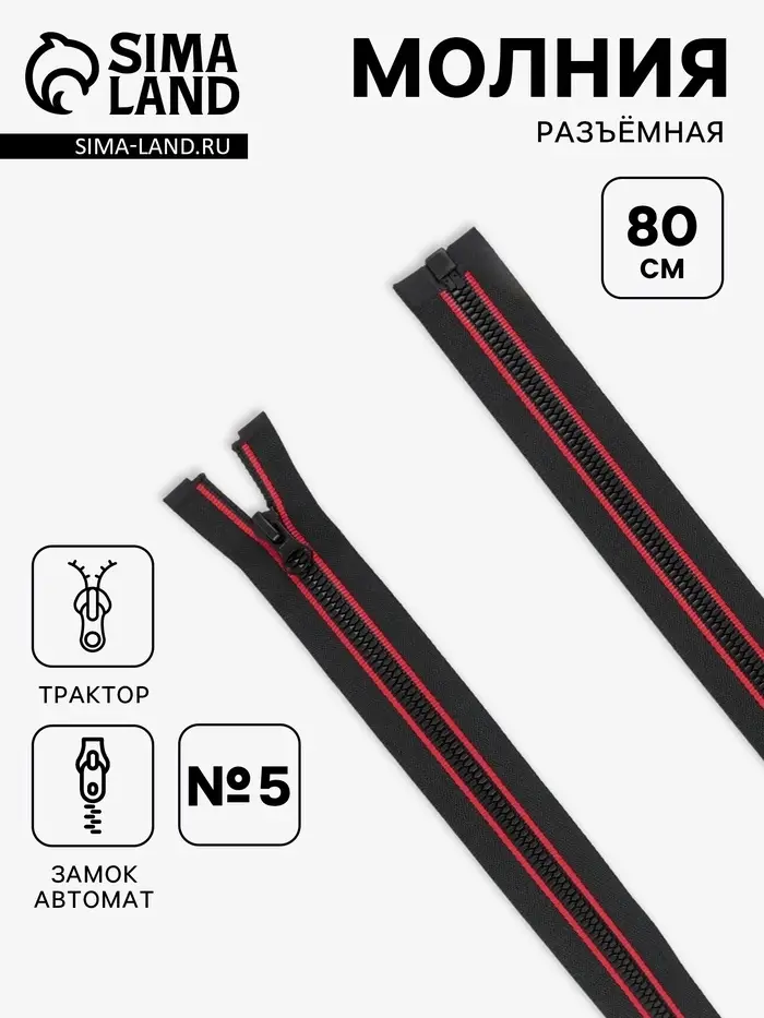 Молния «Трактор», №5, разъёмная, замок автомат, 80 см, чёрная, красная