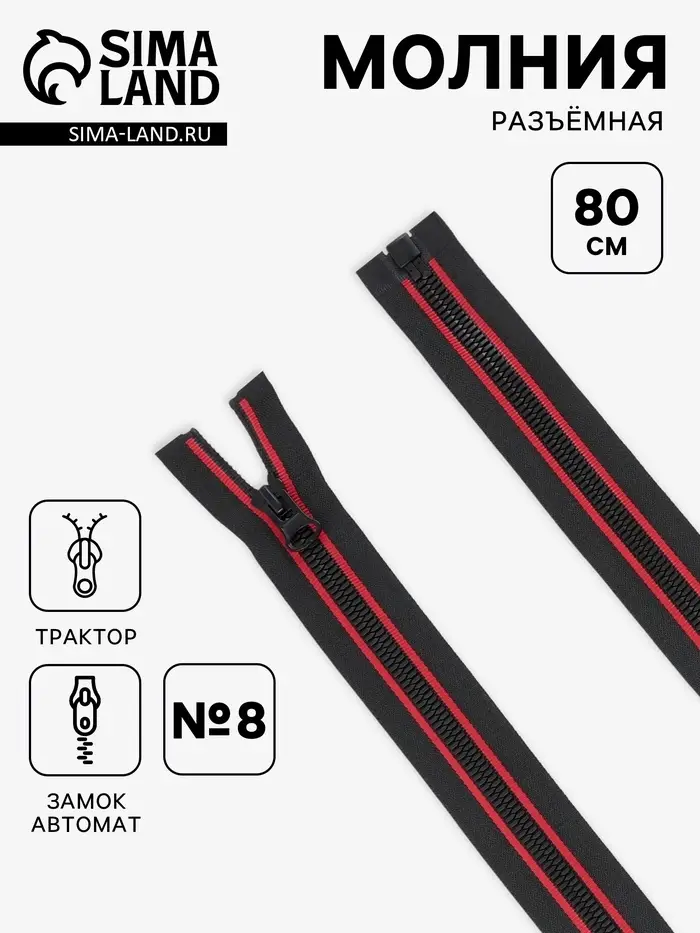 Молния «Трактор», №8, разъёмная, замок автомат, 80 см, чёрная, красная
