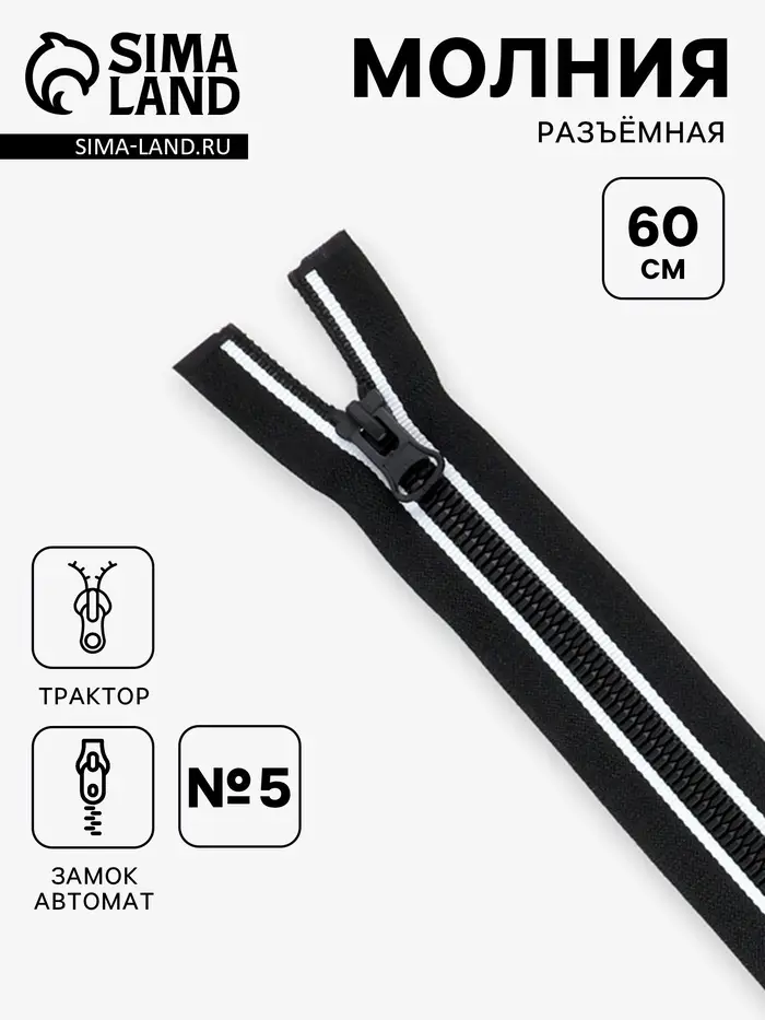 Молния «Трактор», №5, разъёмная, замок автомат, 60 см, чёрная, белая