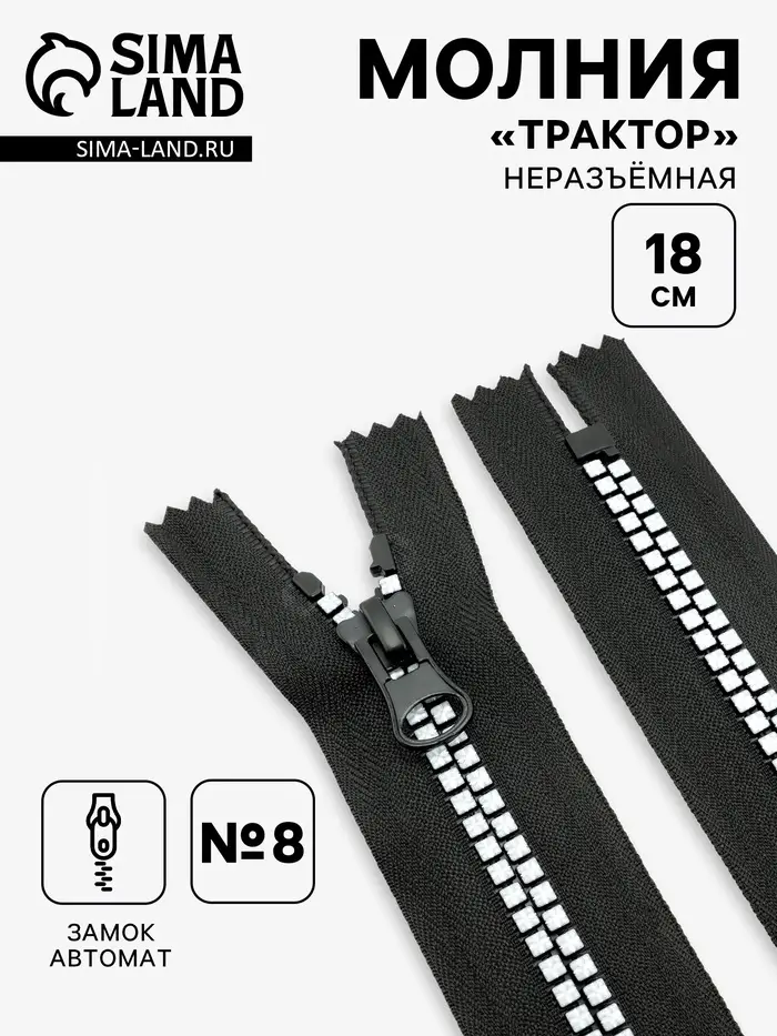 Молния «Трактор», №8, неразъёмная, замок автомат, 18 см, чёрная, белая
