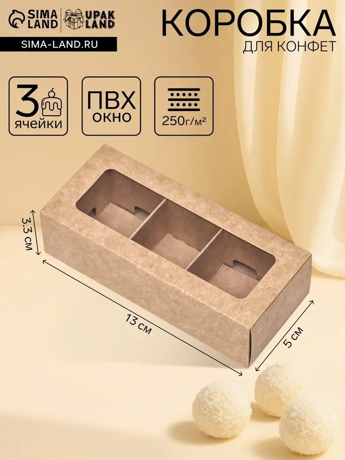 Крафт-коробка для трёх конфет с окном — это компактная и стильная упаковка для небольшого, но значимого подарка. Её натуральный вид и прозрачная вставка подчёркивают качество и индивидуальность каждой сладости.