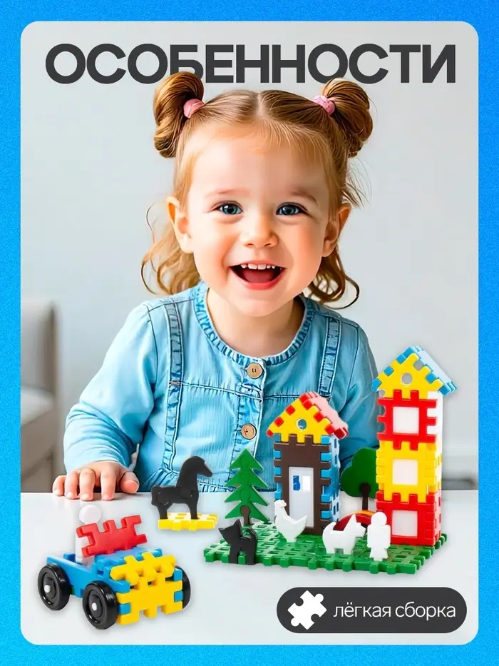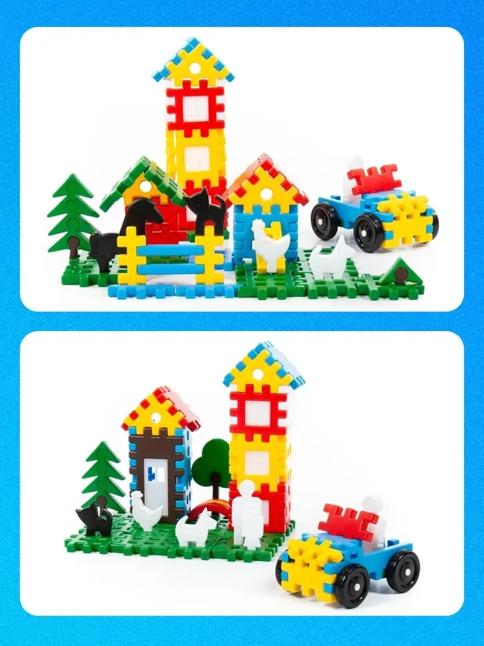 Игровые возможности: Набор создан для свободного строительства, позволяя ребенку самостоятельно придумывать и воплощать идеи. Можно воссоздать дом, двор или даже целую улицу, обыгрывая знакомые жизненные сцены. Это отличный подарок для детей, которые любят собирать, экспериментировать и фантазировать!
