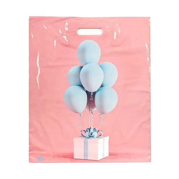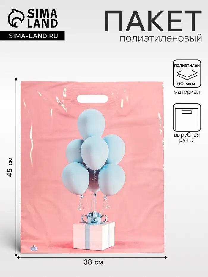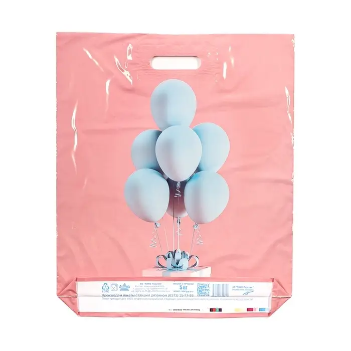 - Праздничный дизайн с шарами: Яркие воздушные шары на нежно-голубом и розовом фоне сразу создают настроение праздника. Такой пакет особенно уместен для детских дней рождения, выпускных в саду или праздничных мероприятий.