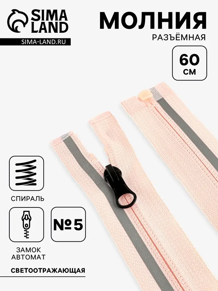 Молния «Спираль», №5, разъёмная, со светоотражающей полосой, замок автомат, 60 см, розовая