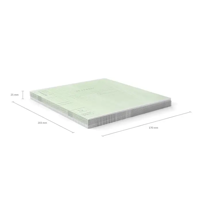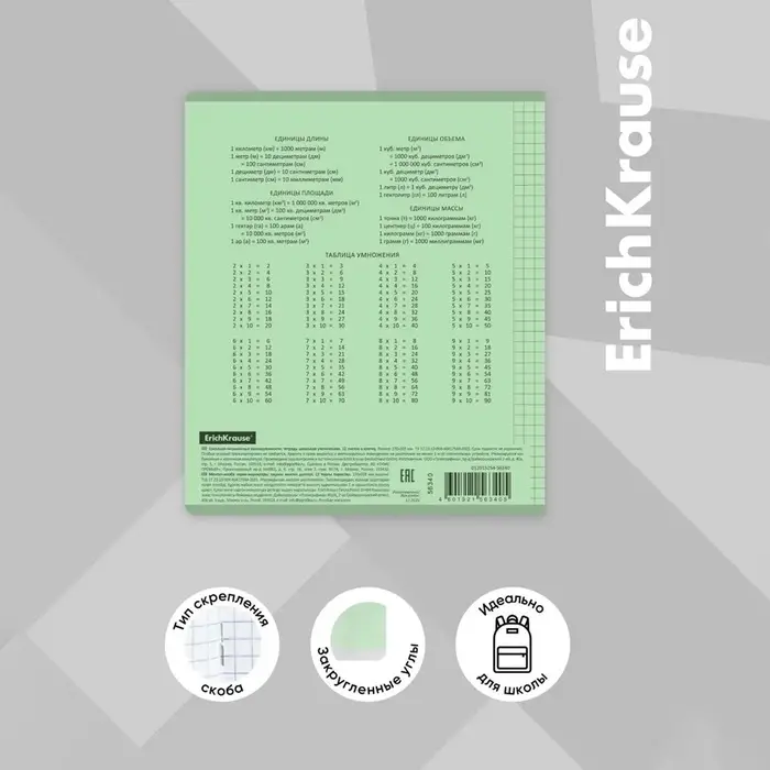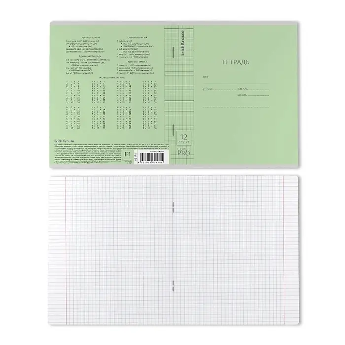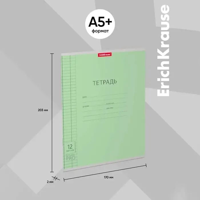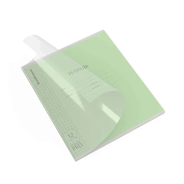 Тетрадь школьная ученическая формата А5+ (170x203 мм). Двойная обложка: внешняя выполнена из высококачественного износостойкого прозрачного пластика с фактурой «апельсиновая корка», внутренняя — из качественной мелованной бумаги. В блоке 12 листов в клетку. Бумага офсетная плотностью 60 г/м2. Цвет линовки — синий. Скругленные уголки обложки и блока. Тип скрепления — скоба. Тетради упакованы в термоусадочную пленку по 10 штук.