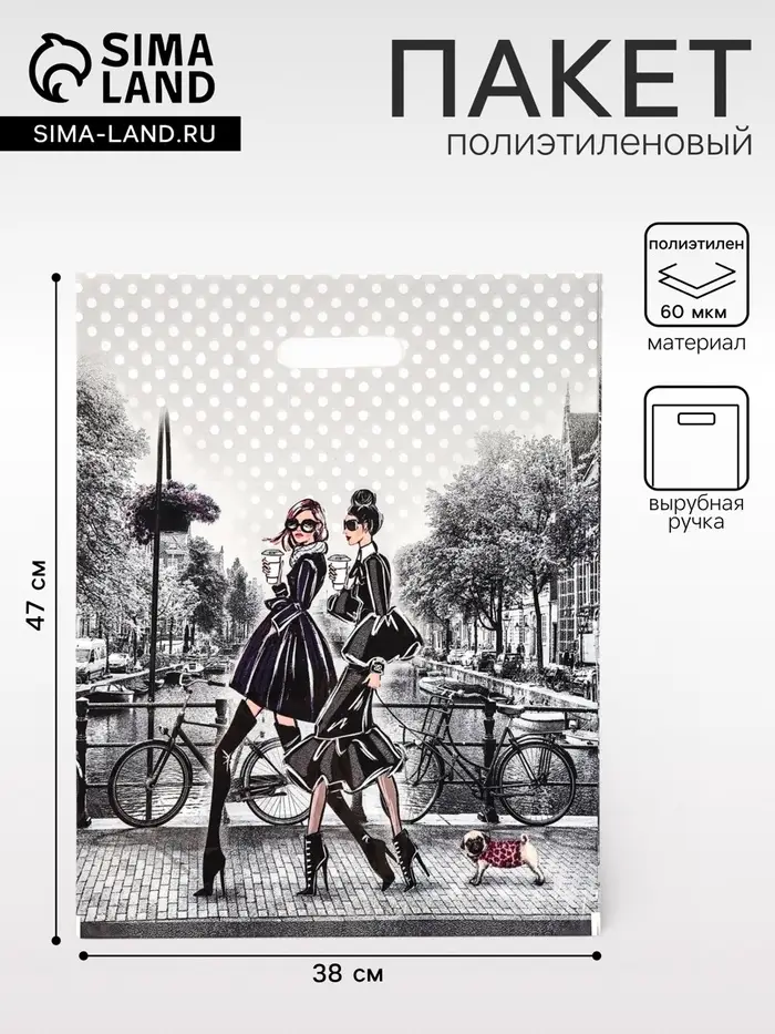 - Современный женственный дизайн: Графичный рисунок с силуэтами девушек и надписью «Подружки» на чёрном или сером фоне выглядит стильно и современно. Такой дизайн подходит для молодёжной аудитории и делает пакет желанным аксессуаром, а не просто упаковкой.