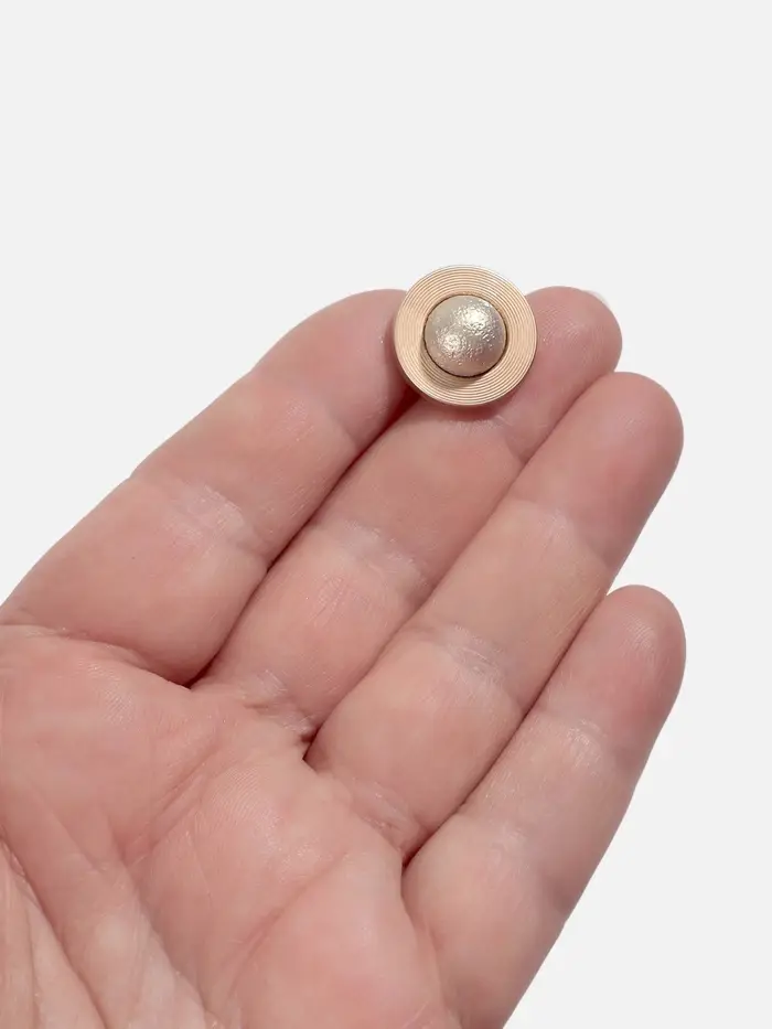 Металлическая декоративная пуговица на ножке диаметром 18 мм в бежево-золотистом оттенке отлично подойдет для украшения верхней одежды, аксессуаров и рукоделия. Эта пуговица отличается прочностью и элегантным внешним видом, добавляя изделиям изысканности и индивидуальности.