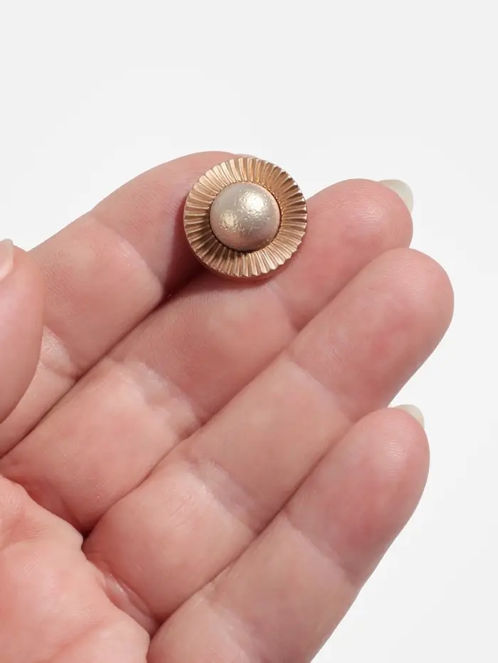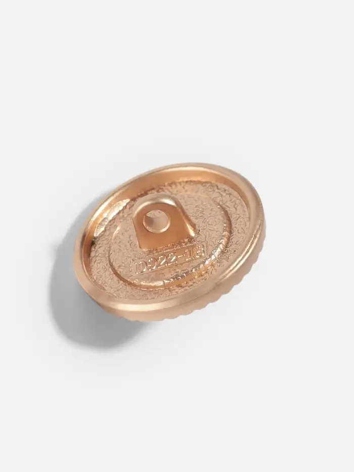 Эта пуговица особенно эффектно смотрится на бархатных и шёлковых изделиях, где подчеркивает благородство ткани. Золотистый оттенок добавляет роскошный акцент в вечерний и деловой гардероб. Кольцевой узор делает её узнаваемым элементом без излишней вычурности.