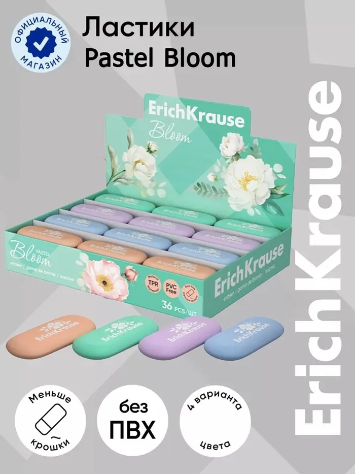 Ластик ErichKrause Pastel Bloom, 54×24×10.3 мм, синтетика, микс