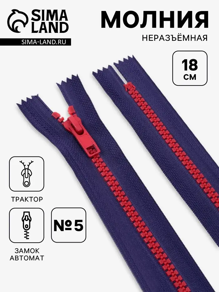 Молния «Трактор», №5, неразъёмная, замок автомат, 18 см, синяя, красная