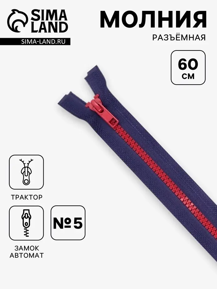 Молния «Трактор», №5, разъёмная, замок автомат, 60 см, синяя, красная