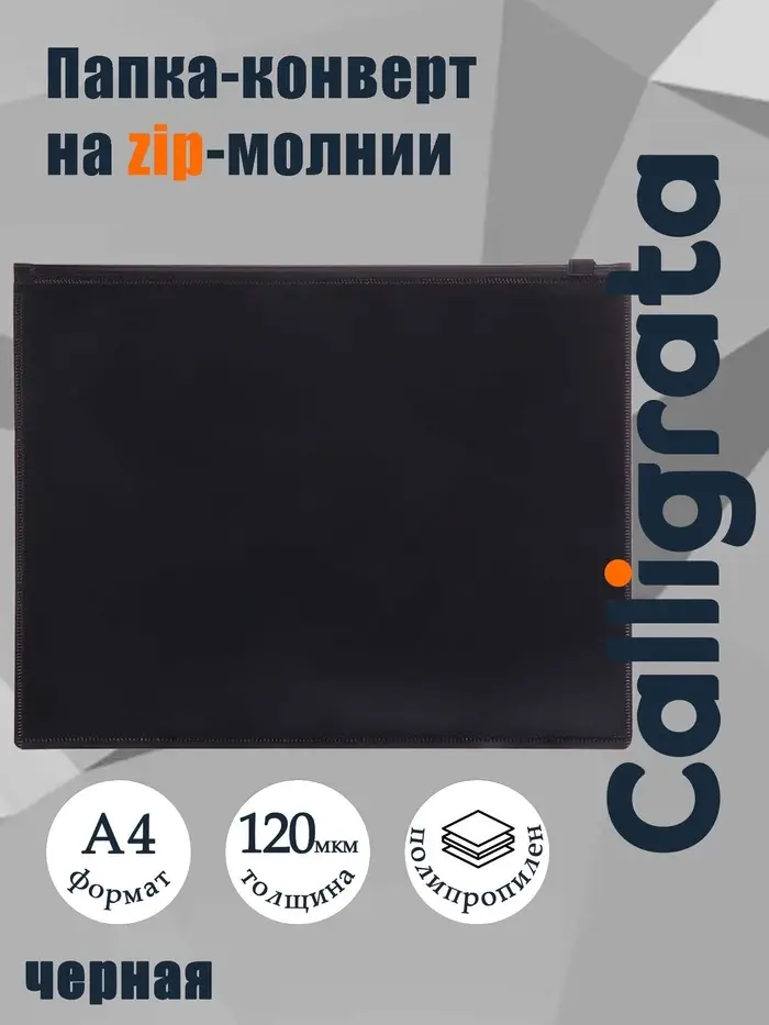 Папка-конверт Calligrata формата А4 закрывается с помощью застежки-молнии. Изготовлена из пластика толщиной 0.15 мм черного цвета. Удобна для переноски документов, предотвращает их смятие и загрязнение. Вместимость 50 листов бумаги А4.