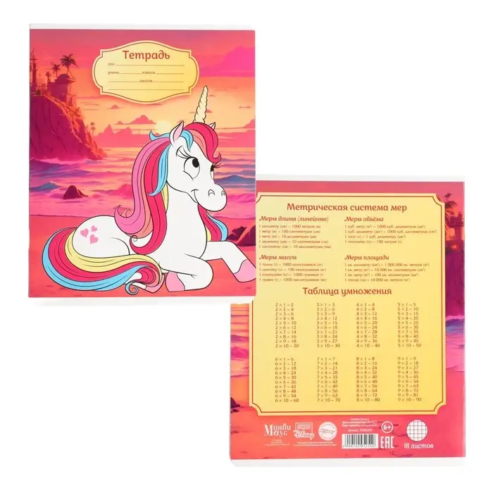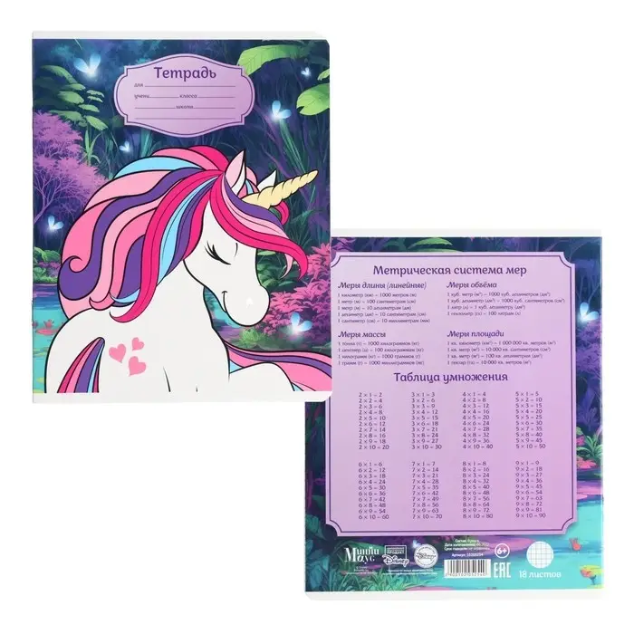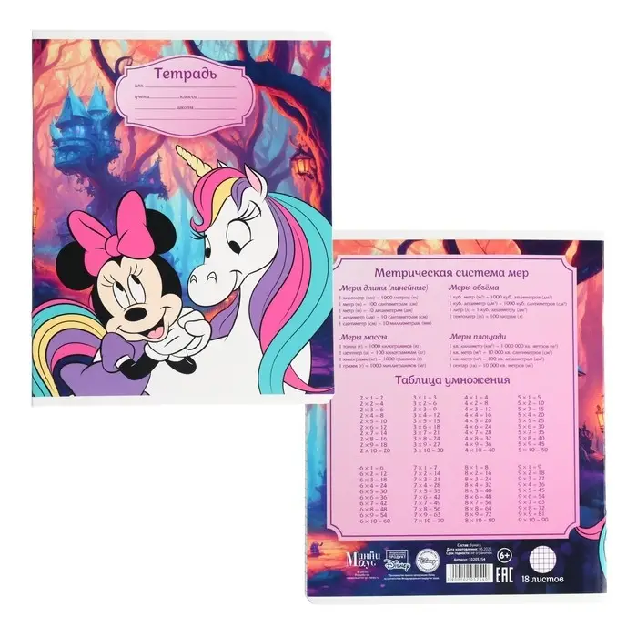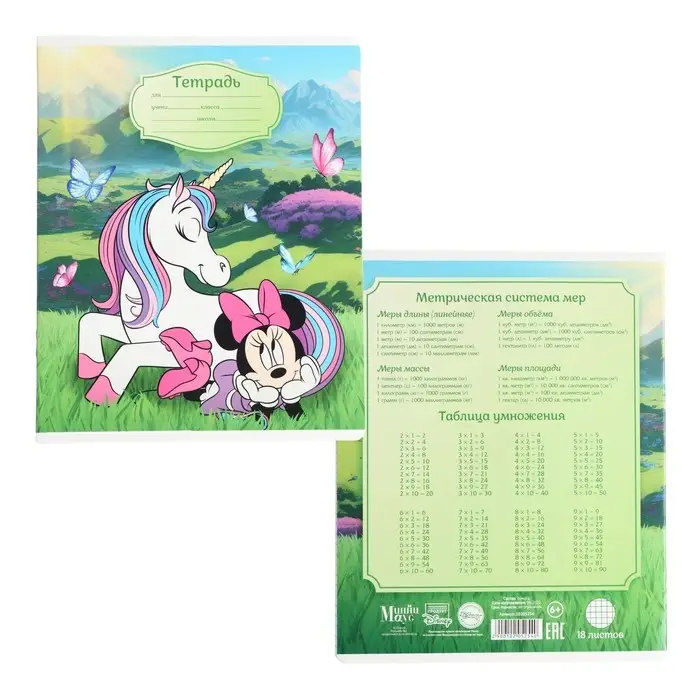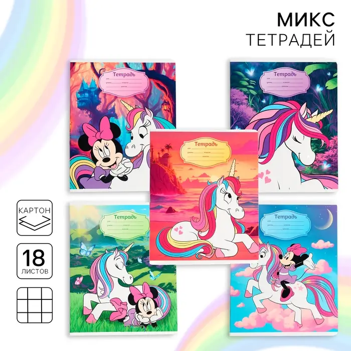 Тетрадь в клетку 18 листов, 5 видов МИКС, обложка мелованный картон, «Минни Маус и единорог»