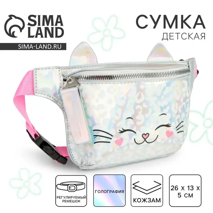 Сумка детская для девочки поясная «Кошечка», на молнии, серебристая
