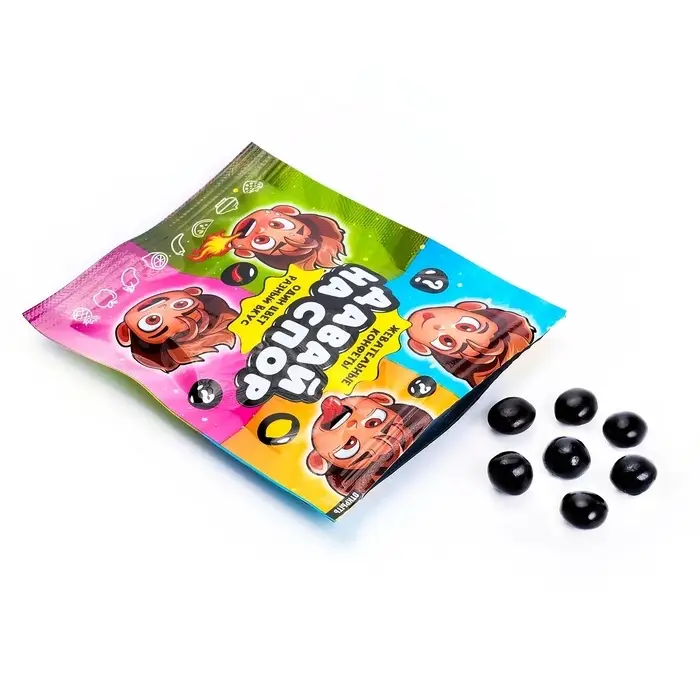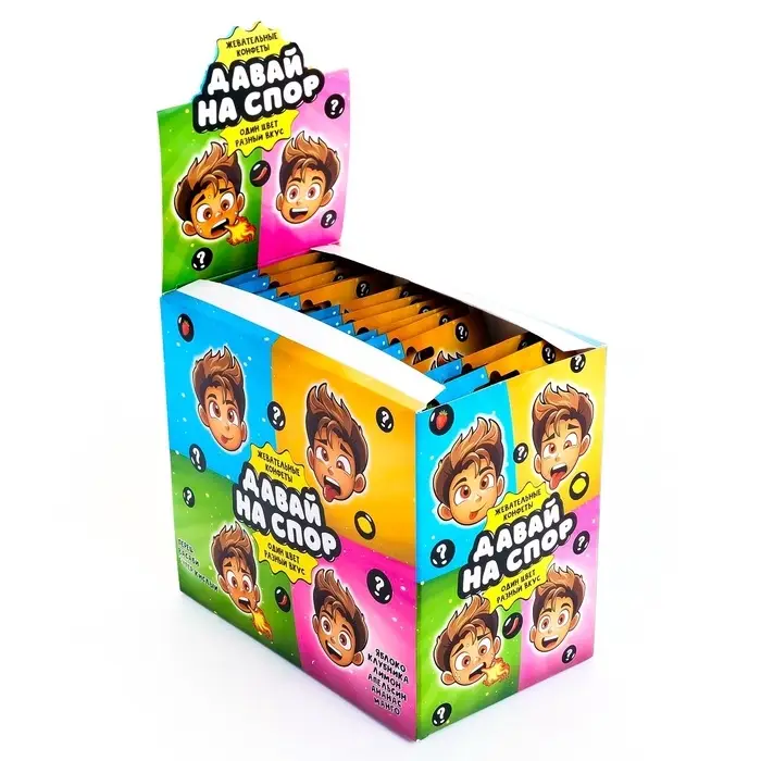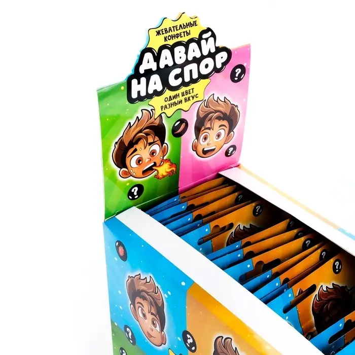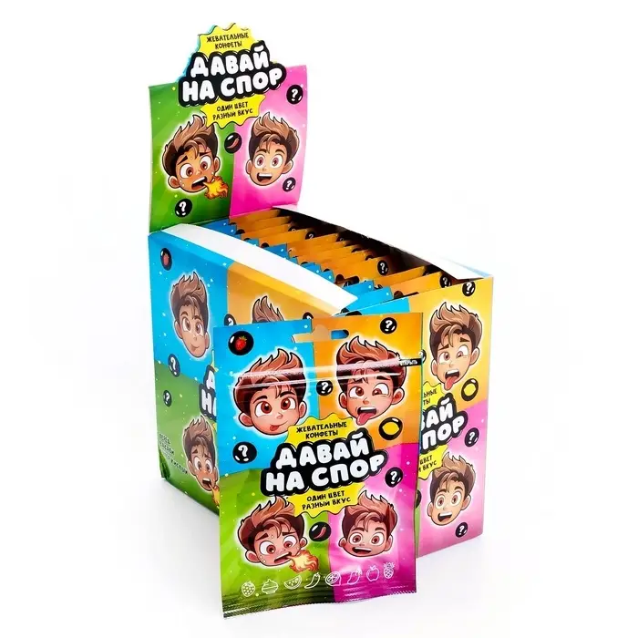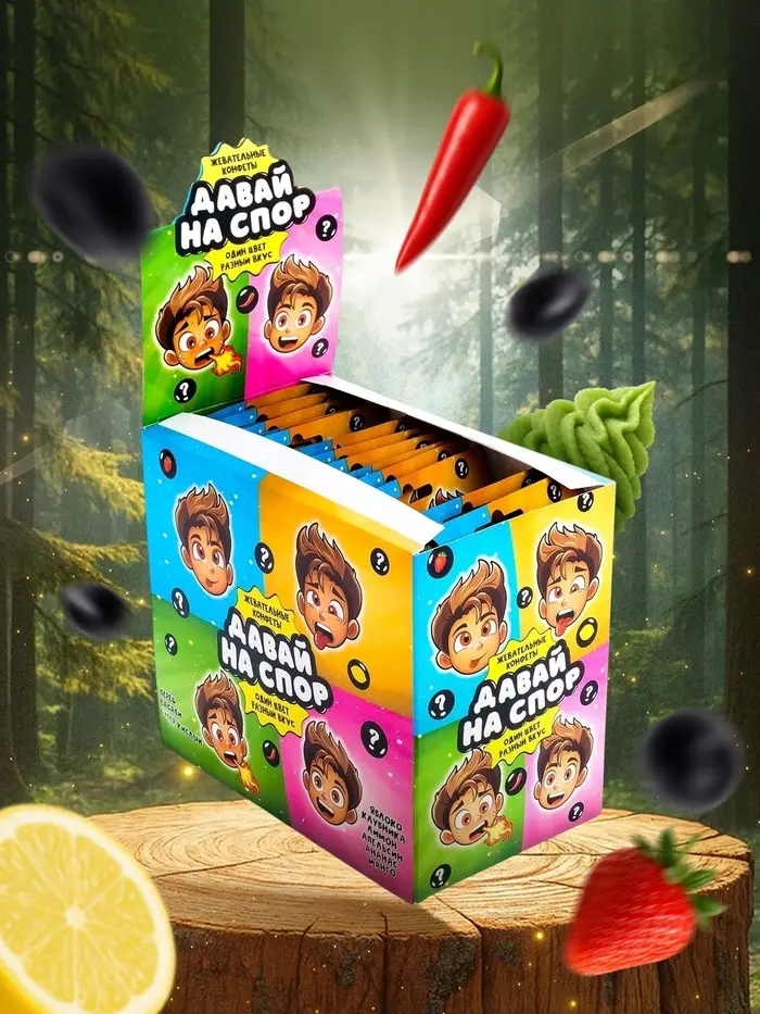 "Давай на спор" — это маленькие круглые жевательные конфеты черного цвета, которые станут ярким развлечением для вас и ваших друзей. Каждая конфета — это вызов, ведь внутри скрывается неожиданный вкус! Вы не знаете, что вам достанется: сладкий фруктовый взрыв, свежесть сочных ягод или неожиданный удар острого васаби или перца.
