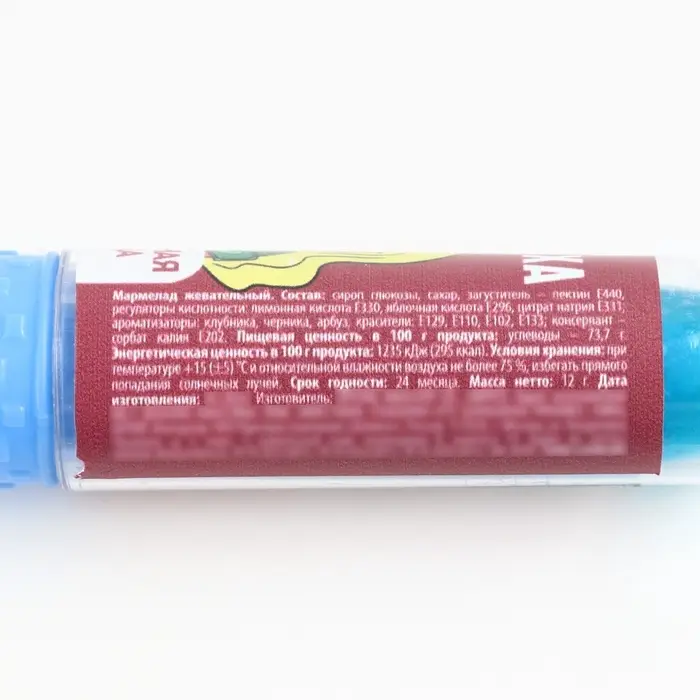 Состав: сироп глюкозы, сахар, загуститель - лектин Е440, регуляторы кислотности: лимонная кислота Е330, яблочная кислота Е296, цитрат натрия Е331; ароматизаторы: клубника, черника, арбуз; красители: Е129, Е110, Е102, Е133; консервант - сорбат калия Е202.