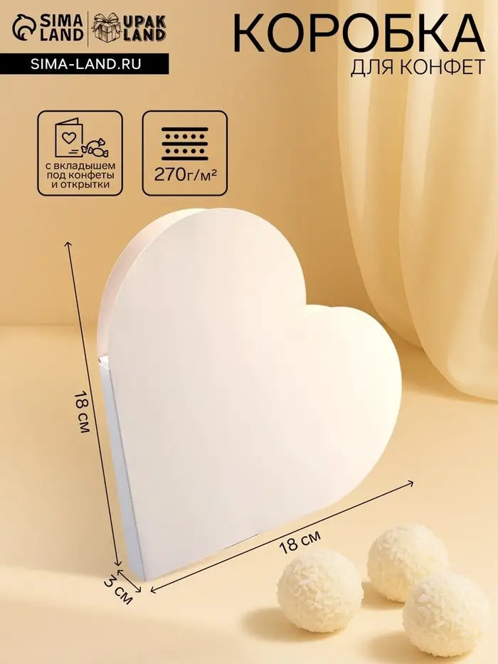 Коробка-сердце из картона с внутренним вкладышем, белая (18×18×3 см) – фигурная упаковка большого размера для наборов конфет, открыток и сувениров. Форма сердца создает романтическое настроение, а внутренний вкладыш надежно фиксирует содержимое при транспортировке. Плотность картона 270 г/м² обеспечивает жесткость и сохранение формы даже при увеличенном размере.