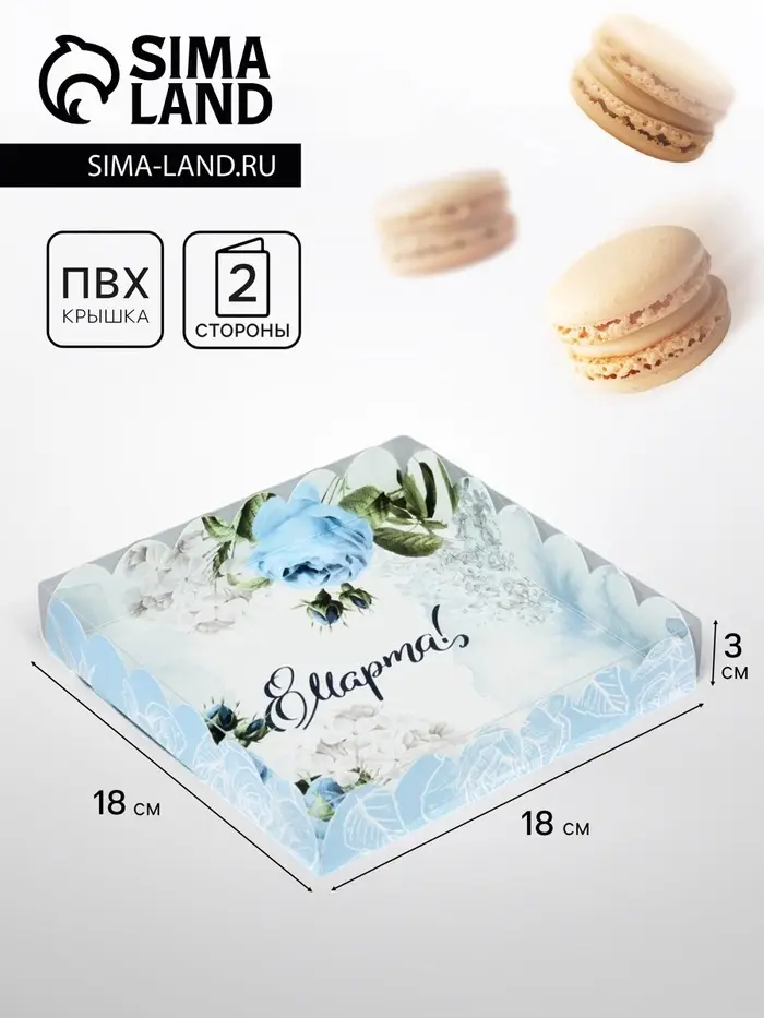 Коробка для печенья, кондитерская упаковка с пластиковой крышкой, «8 марта», 21×21×3 см