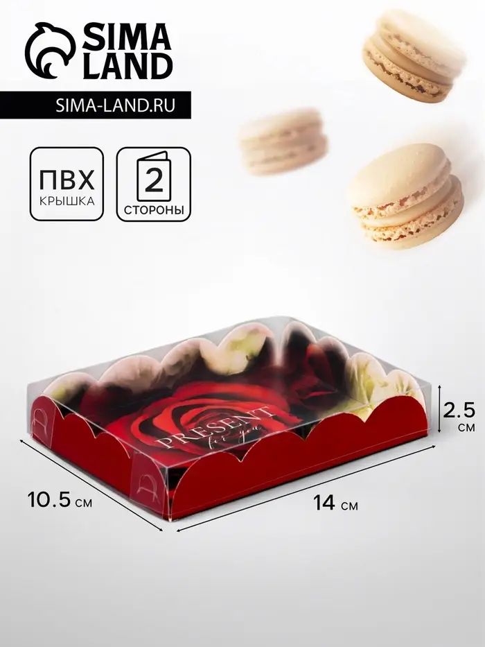 Прочный картон обеспечивает надежную защиту содержимого, а прозрачная крышка позволяет сразу оценить внешний вид угощений без необходимости открывать коробку.