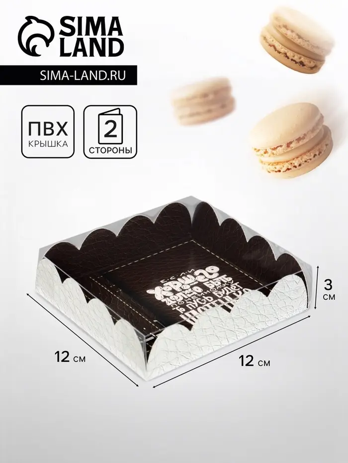 Прочный картон обеспечивает надежную защиту содержимого, а прозрачная крышка позволяет сразу оценить внешний вид угощений без необходимости открывать коробку.